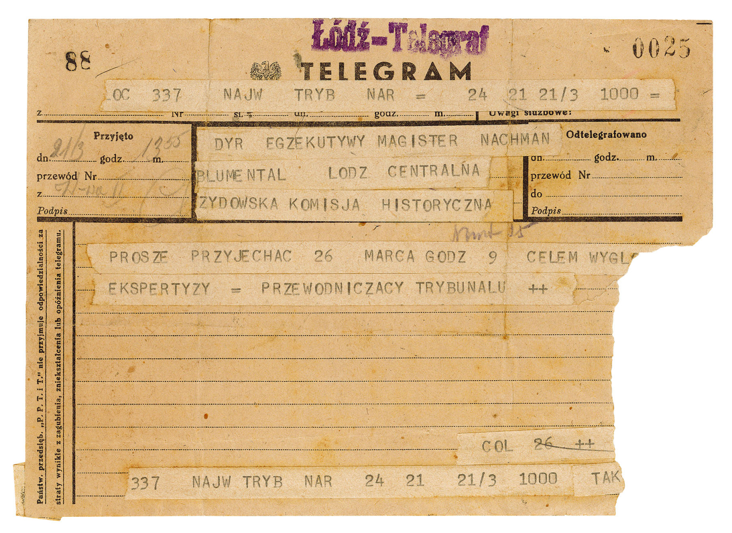 Blumental’s archive also contains a number of unique and original documents, including original Nazi documents, materials he gathered while investigating the murders of his wife and son by the Blue Police (Polish officers who collaborated with the Nazis), and songs and poetry from the ghettos, including many original documents from the Łódź Ghetto.
