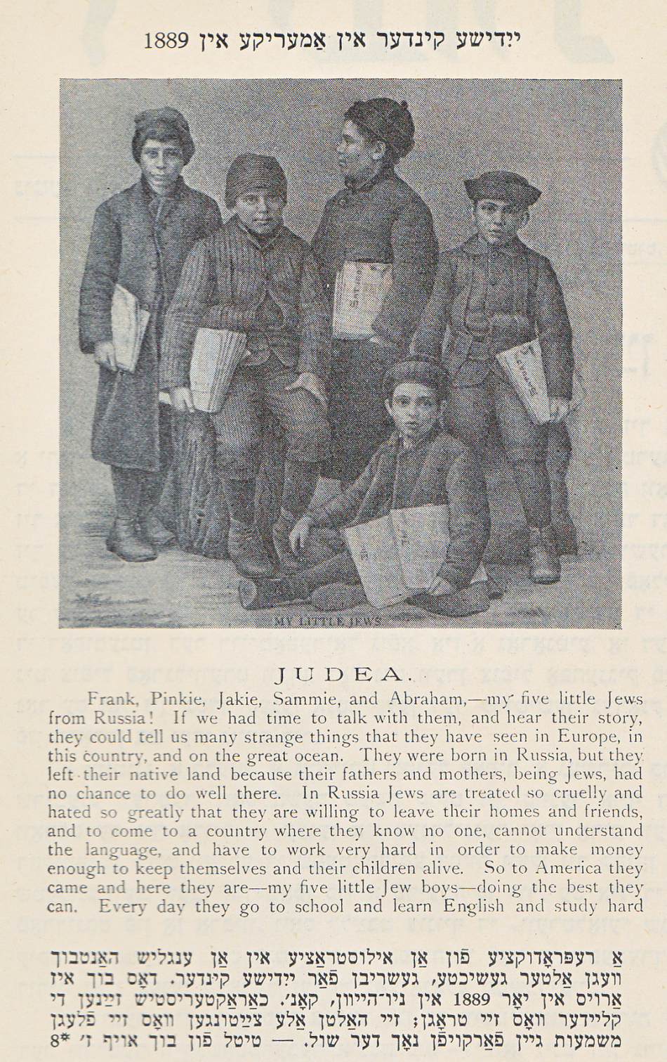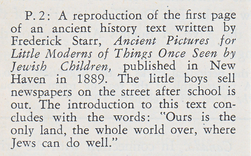 Among the books that came its way in the mid-1940s, was this oddity, Ancient Pictures for Little Moderns of Things Once Seen by Jewish Children, by Frederick Starr, published in New Haven in 1889. The librarians and archivists must have found it as quaint and weird as we do today, though the Yiddish caption in the June 1946 issue of Yedies seems to take it as an ethnographic document on its own terms, pointing out “the characteristic clothing” of the boys in the illustration, newspaper sellers on the Lower East Side.