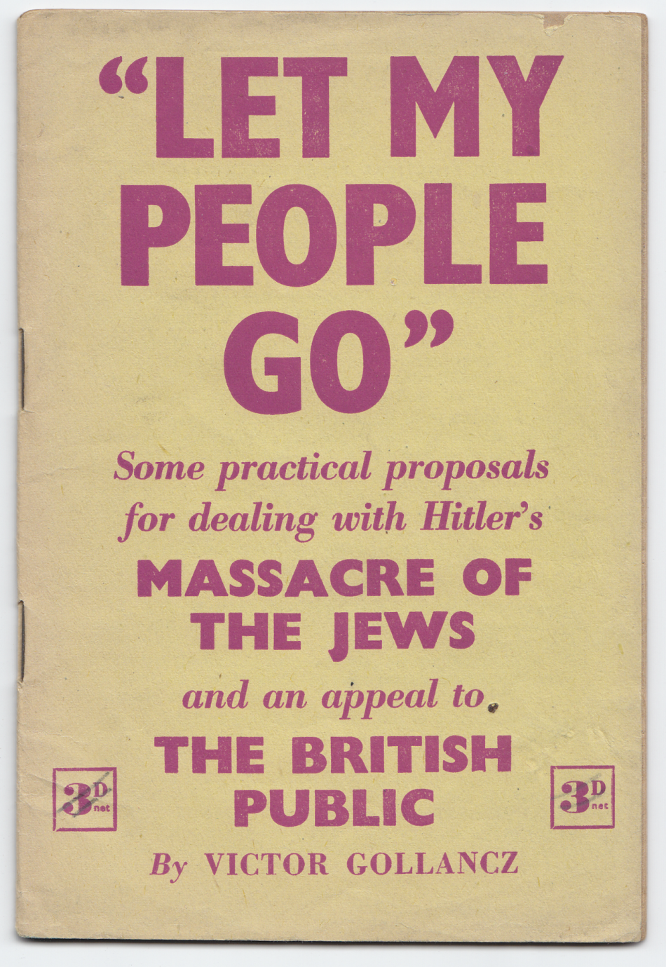 Jean Kerman via the American Jewish Historical Society has donated several pamphlets and books published in 1943-1944 calling public attention to the Holocaust and Jewish armed resistance against the Nazis, including “Let My People Go,” by Victor Gollancz (London: Victor Gollancz, Ltd., 1943).